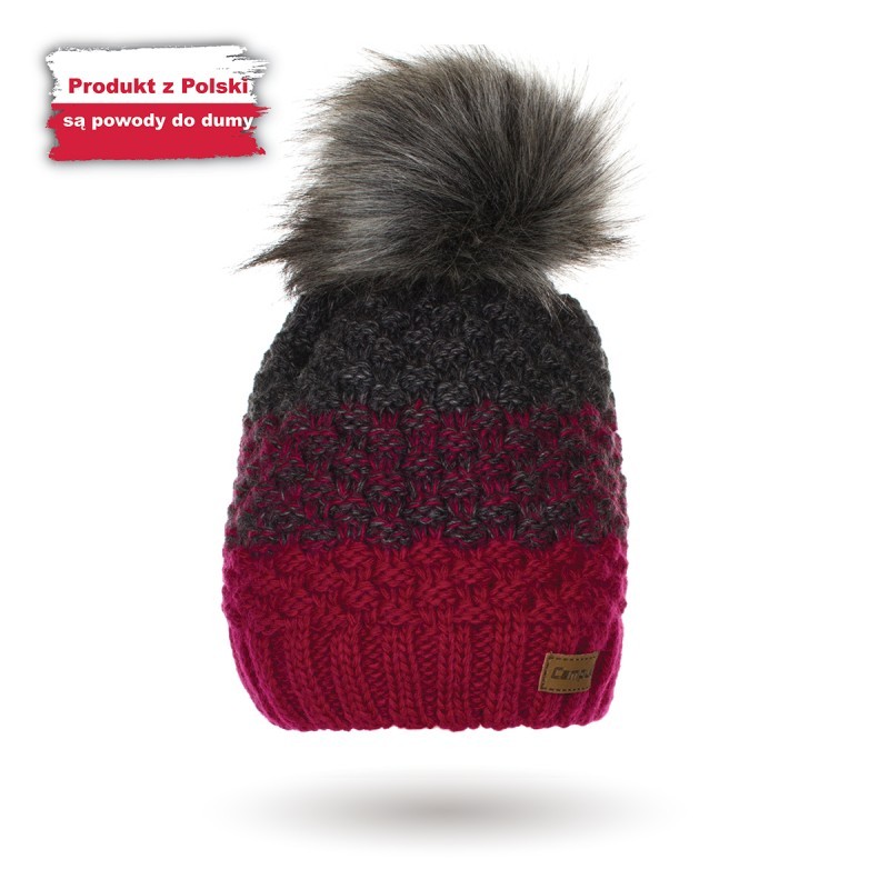 Ciepła, stylowa czapka damska zakończona pomponem ze sztucznego włosia.