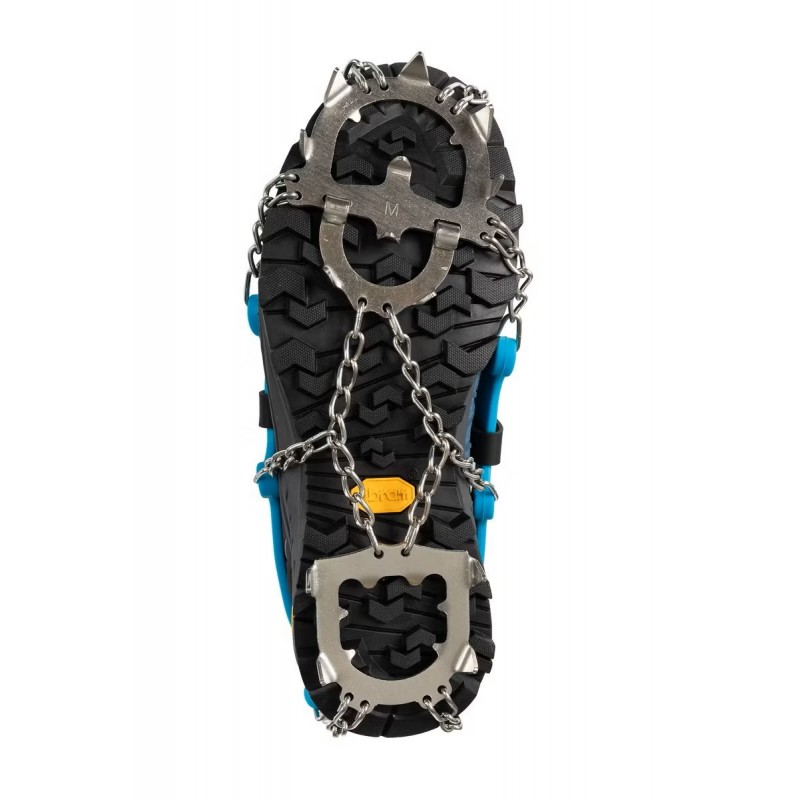 Zęby, łańcuszki i płytki raczków wykonano z wytrzymałej stali nierdzewnej, odpornej na uszkodzenia. Przednia płytka z zawiasem umożliwia naturalny ruch stopy, minimalizując uczucie sztywności. Całość stabilizuje podeszwę i zwiększa trwałość sprzętu.
