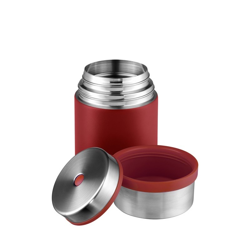 Zakrętka wyposażona jest w praktyczny przycisk do wyrównywania ciśnienia, co ułatwia bezpieczne otwieranie termosu. W zestawie znajduje się także pokrywka pełniąca funkcję miski. Zewnętrzną część naczynia pokryto matową, proszkową powłoką, która zwiększa odporność na zarysowania i poprawia chwyt.